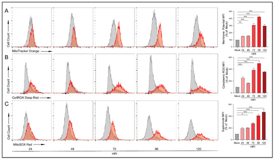 Upregulation of OXPHOS can result in the production of reactive oxygen species (ROS) that exceeds the neutralization ability of the antioxidant systems including nicotinamide adenine dinucleotide (NAD/NADH). At low levels, ROS acts in a variety of intra- and inter-cellular signaling cascades. However, excessive ROS can cause significant cellular oxidative stress resulting in DNA, protein, and lipid damage and potentially cell death [39]. We examined ROS production using CellROX Deep Red, a dye that becomes fluorescent following oxidation by ROS. We detected increases in ROS species which peaked at 96 HPI (Figure 4B). These findings were confirmed using another oxidation dependent dye, CellROX Orange (Supplementary Figure S3C).
