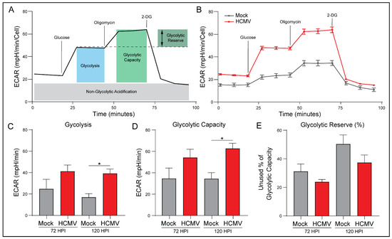 HCMV infection increases glycolysis and glycolytic capacity. (A) Measurements of the extracellular acidification rate (ECAR) determined using a Seahorse XFe24 Glycolysis Stress Kit are illustrated. (B) Representative data output of LN-18 cells mock- or HCMV-infected. (C) Glycolysis, (D) Glycolytic Capacity, and (E) Glycolytic Reserve were derived from these measurements. All samples were normalized to cell number. Graphs represent pooled data from three independent experiments. Mean ± the SEM of at least 3 triplicates. *, p < 0.05.