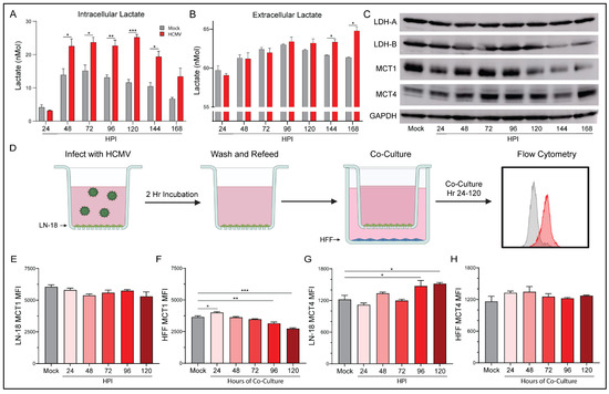 HCMV-associated alterations to lactate dynamics. Lactate concentration was determined in the (A) extracellular and the (B) intracellular compartment of mock- or HCMV-infected LN-18 cells using a colorimetric L-lactate assay kit with a standard. (C) Protein expression of prominent lactate regulators LDH-A, LDH-B, MCT1, and MCT4 were examined following infection using Western blot assays. (D) Schematic of co-culture experiment in which HCMV-infected LN-18 cells were co-cultured, but physically separated from, HFF cells using Transwells with 0.4 μm pores in 6-well culture dishes. At indicated points post infection, cells were collected separately and processed by flow cytometry for expression of MCT1 (E,F) and MCT4 (G,H) in infected LN-18 and non-infected HFF cells respectively. Graphs represent pooled data from three independent experiments. Mean ± the SEM of at least 3 triplicates. *, p < 0.05; **, p < 0.01; ***, p < 0.001. Created with BioRender.com.