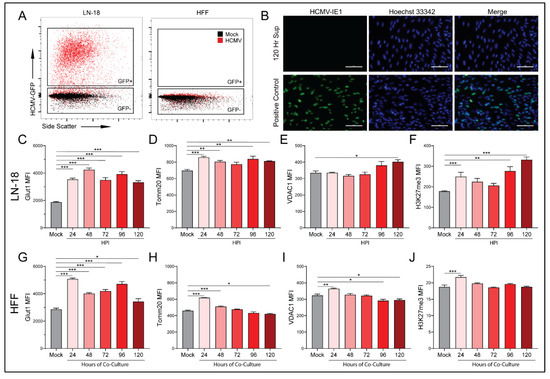 HCMV infected cells alter metabolic pathways of uninfected cells in a paracrine manner. Mock- and HCMV-infected LN-18 cells were co-cultured with HFFs as described in Figure 6D and then the separate populations were subjected to flow cytometry. Infection of LN-18 cells and absence of infection of HFFs was established following 120 Hr co-culture by (A) HCMV-GFP expression. A titer was performed on fresh HFFs using supernatant from the 120 Hr co-culture HFF compartment, to ensure an absence of viral infection, and cells which had been infected with HCMV as a positive control for the immunocytochemistry staining. (B) HCMV-IE1 staining was performed at 20× magnification. HCMV-IE1 is shown in green and Hoechst 33342 stained nuclei are shown in blue. Scale bar: 100 μM. Flow cytometry was used to quantify changes in glycolytic marker (C,G) Glut1, oxidative phosphorylation markers (D,H) Tomm20 and (E,I) VDAC1, and an epigenetic marker (F,J) H3K27me3 in infected LN-18 and non-infected HFF cells respectively. Graphs represent pooled data from three independent experiments. Mean ± the SEM of at least 3 triplicates. *, p < 0.05; **, p < 0.01; ***, p < 0.001.