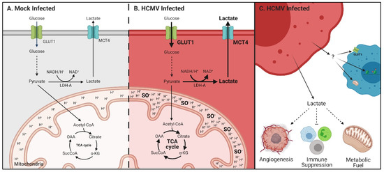 Metabolic reprogramming and paracrine effects of HCMV infection in glioblastoma. Schematic of glycolysis and respiration in (A) mock- and (B) HCMV-infected cells highlighting upregulation of GLUT1 and MCT4 expression; increased lactate production and export; enhanced respiration and resultant increases in mitochondrial membrane potential and superoxide production. (C) HCMV infected cells export lactate which has been reported to increase angiogenesis, suppress the immune response, and can be used as a metabolic fuel by neighboring cells. The secretome from HCMV-infected cells can influence transporter expression, mitochondrial function and induce epigenetic changes in surrounding stromal cells. Created with BioRender.com.