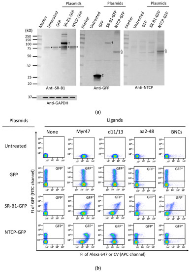 We demonstrated that flow cytometric analysis using a fluorescence-labeled ligand and SR-B1-GFP fusion protein is useful to elucidate the specific binding of a ligand to SR-B1 [14,15,16,21]. Therefore, we applied this method to analysis for the binding of Alexa 647-labeled Myr47 and its analogs to SR-B1-GFP or NTCP-GFP. In addition, we examined CV-labeled BNC binding to SR-B1-GFP and NTCP-GFP and compared the ligand-binding properties of the two receptors.
