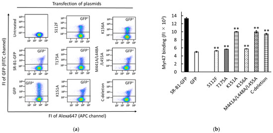 We previously reported analyses concerning the binding site of BNCs to SR-B1 using HEK293T cells transiently expressing SR-B1-GFP mutants [21]. Western blot data to confirm the expression of these mutants employed here were published in the previous report [16]. To compare between BNC and Myr47 binding to SR-B1, we analyzed Myr47 binding to HEK 293T cells expressing SR-B1-GFP and its mutants. Two-parameter dot plot data and the quantification of Myr47 binding to GFP+ subsets in HEK293T cells expressing SR-B1 and its mutants are shown in Figure 2a,b, respectively. S112F and T175A mutations cause the loss of not only the binding of HDL but also that of PC-containing liposomes and BNCs [16,21,22]. We found that these mutations abrogated the binding of Myr47 to SR-B1 too. K156A mutation, which was originally reported to influence silica binding to SR-B1, decreases the binding of PC-containing liposomes and BNCs [16,21,23]. Similarly, this mutation attenuated the binding of Myr47. K151A and M441A/L448A/L455A mutations and the deletion of the C-terminal intracellular domain (i.e., C-deletion) are known to relate SR-B1 multimerization and signal transduction, respectively [24,25]. The two mutations reduce BNC binding to SR-B1, although their reduction rates are lower than the other mutations [16,21]. The same mutations slightly decreased Myr47 binding to SR-B1. As a whole, the effects of mutations in SR-B1 employed here were similar between BNC and Myr47 bindings. These results suggest that the binding sites of SR-B1 for the two ligands are common or substantially close.