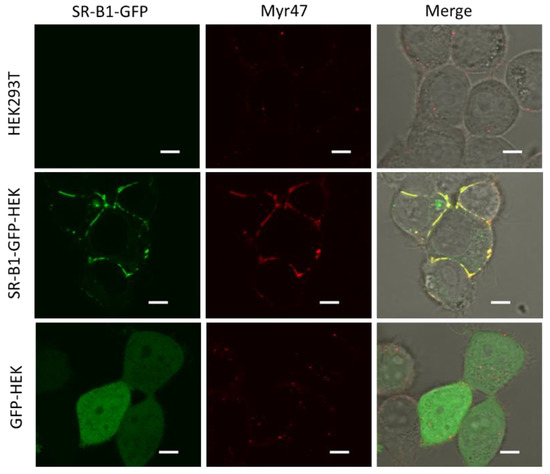 To examine the colocalization of Myr47 and SR-B1-GFP in HEK293T cells, we employed HEK293T cell lines stably expressing SR-B1-GFP (i.e., SR-B1-GFP-HEK cells) or GFP (i.e., GFP-HEK cells). The characteristics of these cell lines have been previously reported [15,16]. As shown in Figure 3, the colocalization of Myr47 and SR-B1-GFP was observed in the surface of SR-B1-GFP-HEK cells under LSM. However, such colocalization was not observed between GFP and Myr47 in GFP-HEK cells. In HEK293T cells that did not express SR-B1-GFP and GFP, dense Myr47 binding, which was observed in SR-B1-GFP-HEK cells, was never detected. These results indicate that Myr47 binds SR-B1-GFP expressed on the cell surface of SR-B1-GFP-HEK cells.