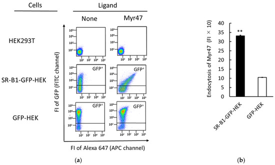 Myr47 uptake in HEK293T, SR-B1-GFP-HEK, and GFP-HEK cells was examined according to the methods as previously described [15,16,21]. Briefly, cells were cultured in the presence or absence of Alexa 647-labeled Myr47 (final Myr47 concentration of 20 nM) in a 24-well plate for 24 h. After cells were harvested via trypsinization, they were subjected to flow cytometry. The quantification of Myr47 endocytosis was calculated using the following formula: (FI of GFP+ subset in Myr47 uptake assays)—(FI of GFP+ subset in Myr47 binding assays).