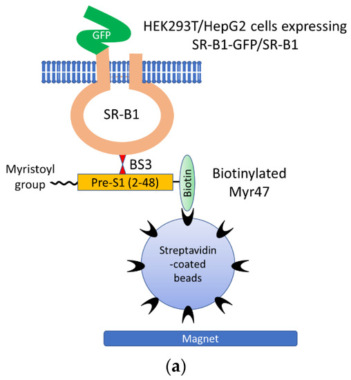 The HBV genome encodes surface proteins that are large (L protein: pre-S1 + pre-S2 + S regions), middle (M protein: pre-S2 + S regions), and small (S protein: S region) [1]. In these surface proteins, the pre-S1 domain of L protein plays a crucial role in the infection of HBV [2,3]. In addition, a synthetic myristoylated pre-S1 peptide (i.e., Myr47) has been reported to suppress HBV infection [4,5,6,7]. It has been proven that Myr47 binds NTCP (encoded by the SLC10A1 gene), and its binding inhibits HBV infection to hepatocytes [8]. The N-terminal myristoylation of pre-S1 is essential to bind NTCP and to prevent HBV infection [4,5,6,7,8]. As to the entry process of HBV/hepatitis D virus (HDV) into host cells, it is currently presumed that viral particles bind heparan sulfate proteoglycans (HSPG) and NTCP on the surface of hepatic cells, and then a complex of HBV and receptors are endocytosed; their genome is finally released into the cytoplasm of host cells, although the precise mechanism of this process is still unclear [9,10]. Myr47 (also referred to as bulevirtide) is used to treat patients infected with HDV/HBV [11,12]. On the other hand, BNCs with myristoylated N-terminal L protein on their surfaces are endocytosed in a hepatic cell line, HepG2, independent of NTCP expression [10]. Therefore, there is a possibility that myristoylated L protein or Myr47 can bind other receptors different from NTCP. Furthermore, it is suggested that Myr47 interacts with phospholipid membranes in a nonspecific manner [13]. However, little is known about a definitive receptor which can bind Myr47 other than NTCP.