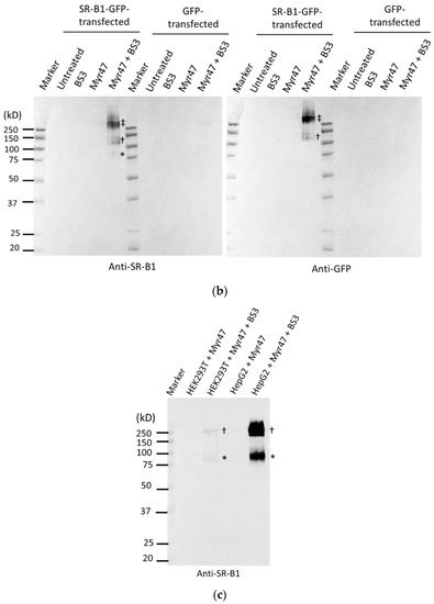 Crosslink of Myr47 and SR-B1-GFP or endogenous SR-B1. (a) Illustrated image of pull-down assays to detect SR-B1-GFP or endogenous SR-B1 crosslinked with biotinylated Myr47 using BS3. (b) Western blot analyses of pull-down samples prepared from HEK293T cells expressing SR-B1-GFP or GFP after sequential treatment with Myr47 and BS3. HEK293T cells transfected with indicated expression plasmids were incubated with or without biotinylated Myr47. Subsequently, they were treated with or without BS3. Cell lysates were prepared, and then they were applied for pull-down assays using streptavidin-coated beads and a magnet. The same volume (10 μ) of samples was applied for SDS-PAGE and Western blot analyses. Antibodies used for the detection of protein bands are indicated under the picture. Symbols, *, †, ‡, indicate Myr47-binding endogenous SR-B1 multimer, SR-B1-GFP-monomer, and SR-B1-GFP multimer, respectively. (c) Western blot analyses of pull-down samples prepared from HEK293T or HepG2 cells expressing endogenous SR-B1 after sequential treatment with Myr47 and BS3. HEK293T or HepG2 cells were treated with biotinylated Myr47 and BS3. Then, pull-down assays and Western blot analyses were carried out as described in (b). Symbols, * and †, indicate Myr47-binding endogeous SR-B1 monomer and multimer, respectively.