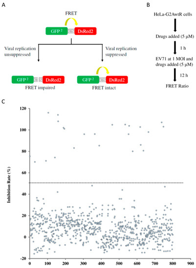 - Lu, W.-W.; Kung, F.-Y.; Deng, P.-A.; Lin, Y.-C.; Lin, C.-W.; Kung, S.-H. Development of a fluorescence resonance energy transfer–based intracellular assay to identify novel enterovirus 71 antivirals. Arch. Virol. 2016, 162, 713–720. [Google Scholar] [CrossRef]