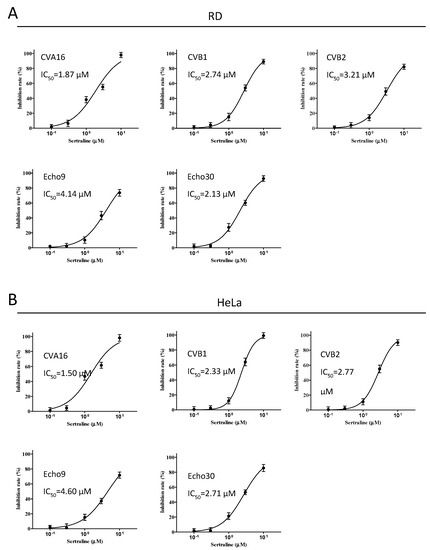 Sertraline (Supplementary Figure S1) was chosen for further characterization because this drug exhibited the strongest inhibition with relatively high selectivity indexes (Sis~20). We examined the antiviral spectrum of sertraline against a panel of representative EV serotypes, namely CVA16, CVB1, CVB2, Echo9, and Echo30. In all the species, sertraline exerted antiviral effects albeit to various extents, with IC50 values ranging from 1.87 to 4.14 μM and from 1.50 to 4.60 μM in the RD and HeLa cells, respectively (Figure 3).