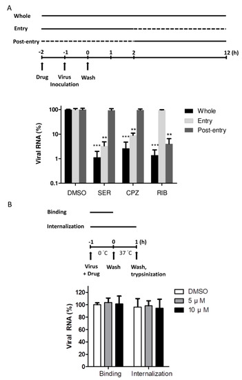 Timing of EV71 inhibition by sertraline. (A) Time-of-addition assay with the schematic representation. Each compound was added to RD cells at the indicated times relative to viral infection at an MOI of 0.1 at 37 °C, with the initiation (−1 h) and completion (0 h) of viral adsorption indicated. Solid and dashed lines indicate the periods with and without compound treatment, respectively. Whole: −2 to 12 h; entry: −2 to 2 h; post-entry: 2–12 h. Sertraline (SER), 10 μM; chlorpromazine (CPZ), 20 μM; ribavirin (RIB), 100 μM. (B) The binding and internalization assay with the schematics. EV71 at an MOI of 5 was allowed to bind to the cells on ice for 1 h in the presence of 5 or 10 μM of sertraline or without drug treatment. For the binding assay, unbound virus was extensively washed off. For the internalization assay, the cells were warmed to 37 °C for 1 h after incubation on ice, allowing viruses to enter cells. Cell surface–bound viruses were removed using trypsin. Quantitative reverse transcription polymerase chain reaction (RT-qPCR) was conducted using total RNA prepared from each condition in (A,B), and shown as relative levels to drug-free control containing 0.05% DMSO. These data were from three independent experiments. ** p < 0.01; *** p < 0.001.