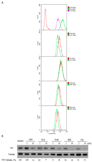 Next, we investigated endosomal trafficking, a step following the viral internalization step at the viral entry stage. Sertraline shows a structural and physicochemical property characteristic of lysomotropic cationic amphiphilic drugs (CADs) (Supplementary Figure S1). CADs contain a hydrophobic aromatic ring and segregated hydrophilic segments with an ionizable amine functional group. Owing to their amphiphilic nature, CADs tend to permeate the membrane, and they undergo protonation and are trapped inside acidic intracellular compartments such as late endosomes and lysosomes. This process can result in alkalization and the consequent physiological impairment of the endolysosomal pathway crucial for EV entry [33,34,35]. We examined whether sertraline treatment caused the alkalization of acidic cellular compartments labeled by the LysoTracker dye that emits red fluorescence only when the dye has entered an acidic milieu such as endolysosomes [23,34]. Two other known SSRIs, fluvoxamine and paroxetine, were used for comparison (Supplementary Figure S1) [16]. Two CADs, chlorpromazine and chloroquine, were included because chlorpromazine can target CME and chloroquine is a known inhibitor of endosomal acidification; both the drugs inhibit EVs independent of the SSRI activity [8,36]. The results of flow cytometry analysis revealed that among the three tested SSRIs, sertraline exerted the strongest alkalization effect, followed by paroxetine and fluvoxamine, according to the curve-shifting profile (Figure 5A). Next, these drugs were used to examine antiviral activity against EV71 infections. Sertraline displayed the strongest inhibitory effect, followed by paroxetine, whereas fluvoxamine exhibited the weakest antiviral activity (Figure 5B). These data indicated that the ability of endosomal alkalization is positively correlated with antiviral activity, which is likely independent of SSRI activity.