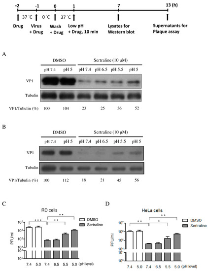 Exposure of the cells to low pH alleviated the antiviral activity of sertraline. The low-pH exposure assay with the schematic representation. (A,C) RD and (B,D) HeLa cells were pretreated with 10 μM sertraline for 1 h. EV71 was used to inoculate the pretreated cells at an MOI of 1 in the presence of 10 μM sertraline on ice for 1 h. The supernatant containing unbound virus was removed, and the cells were incubated with medium containing 10 μM sertraline at 37 °C for 1 h. The cells were incubated with media with different pH values (7.4, 6.5, 5.5, and 5.0) that contained 10 μM sertraline for 10 min and then replaced with 10 μM sertraline-containing medium (pH 7.4). (A,B) At 6 h after the addition of the media with the different pH values, levels of viral VP1 protein and tubulin (the internal control) were measured by Western blot. The percentage shown below each lane represents the intensity of viral VP1 relative to that of tubulin. (C,D) At 12 h after the addition of the media with the different pH values, viral titers from the supernatants were titrated by plaque assay. Triplicated experiments were conducted (* p < 0.05; ** p < 0.01; *** p < 0.001).
