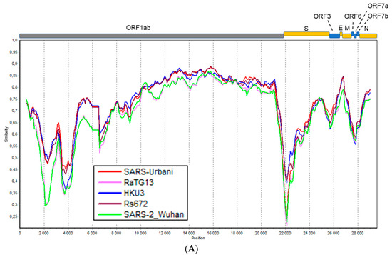 The nucleotide and deduced amino-acid sequences were aligned using ClustalW implemented in the MEGAX v. 10.2 software (https://www.megasoftware.net) (accessed on 14 November 2021) [12]. In total, 40 complete genome sequences of certain sarbecoviruses from GenBank were used for the analysis. The alignments obtained for the ORF1a, ORF1b, S, ORF3, E, M, ORF6, ORF7a, ORF7b, and N proteins were used to determine value of identity (%) between different viruses. For phylogenetic analysis the best substitution model was evaluated for each alignment using the model selection module in the MEGAX software. Phylogenetic trees for RdRp, S, and N gene were inferred using the “maximum likelihood” method using the appropriate model (GTR + G + I) with 1000 bootstrap replicates using the MEGAX software. Similarity plot analysis was conducted using the SimPlot v. 3.5.1 software (https://sray.med.som.jhmi.edu/SCRoftware/SimPlot) (accessed on 14 November 2021) [13]. Possible recombination was analyzed using the RDP5 v. Beta 5.05 software (http://web.cbio.uct.ac.za/~darren/rdp.html) (accessed on 14 November 2021) [14]. RDP, GENECONV, bootscan, maximum chi-square, Chimaera, 3Seq, and SiScan methods were used with default setting and Bonferroni corrected p value cutoff of 0.05 as implemented in RDP5 v. Beta 5.05 software. Recombination events were accepted if detected by at least four methods and confirmed by phylogenetic analysis.