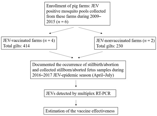 Studies conducted since 1976, The JEV-specific neutralizing antibodies was higher than 50% annually in non-vaccinated pigs’ serum specimens collected from slaughterhouses and pig farms. Thus, JEV is actively transmitted in pig farms in Taiwan, and more than 50% of pigs are infected annually [6,7]. To prevent the confounding effect on vaccine effectiveness estimation owing to previous JEV infection, the pregnancy status of the first litter of the gilts was recorded. During the 2016–2017 JEV-epidemic season, from April to July in Taiwan, the occurrence of stillbirth/abortion was recorded by active surveillance through telephone inquiry every morning, and two stillborn/aborted fetuses were collected from each litter. This field study protocol was approved by the Institutional Animal Care and Use Committee of National Chung Hsing University (Protocol No: 108–117).