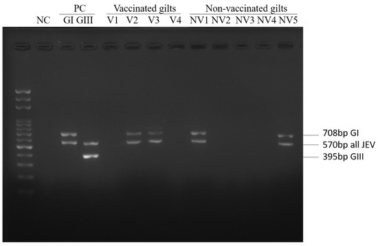 The collected brain tissue of aborted fetuses was subjected to JEV genotyping using a multiplex RT-PCR assay [21] to determine the infected genotype causing stillbirth/abortion (Figure 2). All JEV-positive tested specimens showed the 708 and 570 base-pair DNA products and were classified as having GI infection. Eight JEV-positive specimens belonging to six litters were collected from three JEV-vaccinated farms (except Farm A), and 19 positive specimens belonging to 13 litters were collected from two JEV non-vaccinated farms (Table 3 and Table S1). Thus, six of 389 (1.54%) and 13 of 213 (6.10%) stillborn/aborted litters were JEV-confirmed among the JEV-vaccinated and non-vaccinated pig farms, respectively (p < 0.05).