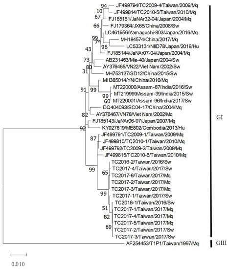 Japanese encephalitis (JE), caused by Japanese encephalitis virus (JEV) infection, is an important zoonotic viral disease in East/Southeast/South Asia [1,2]. JEV circulates among amplifying hosts, including swine, birds, and Culex mosquitoes, mainly Culex tritaeniorhynchus [1]. Humans and other affected domestic animals (such as goats and horses) are dead-end hosts in the JEV transmission cycle because of the low level and short duration of viremia [3]. Vaccination is the most effective prevention strategy for JE, and only licensed GIII-based vaccines are available for use in humans and swine [4,5]. As Taiwan is in a JEV endemic region, residential children are routinely vaccinated with four doses of inactivated JEV vaccine or two doses of 17D-JEV chimeric vaccine, whereas swine gilts receive two doses of live-attenuated vaccine [6,7].