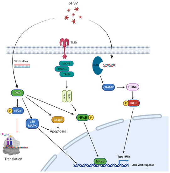 Signal transduction pathways in tumor cells and targeting for oHSV replication and spread. PKR signaling (left) confers a strong defense against viral infection which is activated by dsRNA from viral infection leading to auto-phosphorylation of PKR which phosphorylates eIF-2α. Phosphorylated eIF-2α leads to inhibition of cellular translation and prevents viral protein translation in the process. The PKR pathway is attenuated by oHSV via ICP34.5 which regulates PP1 and leads to PP1-mediated dephosphorylation of eIF-2α. VHS is an oHSV tegument nuclease that is able to degrade viral RNA and thus avoid PKR signaling activation. Furthermore, US11 of oHSV directly interacts with PKR and prevents its auto-phosphorylation. Additionally, PKR regulates cellular apoptosis pathways via Caspase 8 and p38-MAPK signaling, and also contributes to anti-viral response via p38–MAPK and NF-κB signaling pathways. Toll-like receptors (middle) are another pathway activated in infected cells and are able to detect viral nucleic acids. Upon entry of virus in the host cell, endosomes of infected cells detect viral nucleic acids leading to TLR activation. This leads to the recruitment of the adaptor protein, MyD88 and complexes with IRAK and TRAF6 ultimately leading to NK-κB activation and an anti-viral response. cGAS-STING signaling (right) is activated through viral dsDNA and is detected by cell cyclic GMP–AMP synthase(cGAS). Activation of cGAS leads to synthesis of 2′,3′-cGAMP and causes activation of its downstream target located on the cell’s endoplasmic reticulum, STING. Activation of STING leads to creation of autophagosomes and causes upregulation of Type I interferon gene expression and a strong anti-viral response. These pathways may be targeted with oHSV transgenes or innate features of oHSV to attenuate the host tumor cell anti-viral response.