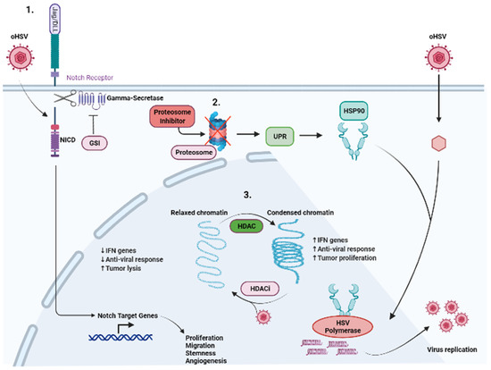 Modulation of cellular signaling to synergize with oHSV therapy. Multiple signaling pathways have been targeted in conjunction with oHSV therapy and highlighted are specific pathways which have been investigated. (1) Notch signaling highlights where Notch ligands from adjacent infected cells are binding to Notch receptors on uninfected cells. Binding of the Notch ligand causes a “pull” on the receptor, exposing the cleavage site on Notch-ICD (NICD). Gamma-secretase cleaves the NICD which subsequently leads to the expression of Notch target genes, leading to the growth, proliferation, and survival of tumor cells. Furthermore, oHSV infection can directly activate NOTCH signaling, leading to the cleavage and translocation of NICD to the nucleus, where it regulates tumor cell proliferation, stemness and angiogenesis. Gamma-secretase inhibitors in conjunction with oHSV have shown increased tumor cell killing and viral replication. (2) Cellular proteasomes are responsible for clearing viral proteins and viral capsids, and dampen the oHSV effect. Proteasome inhibition leads to an increase in UPR which induces HSP90 expression. HSP90 facilitates the translocation of HSV polymerase into the nucleus, leading to increased viral replication. The combination of oHSV and proteasome inhibitors leads to decreased IFN gene expression and anti-viral response as well as increased unfolded proteins and increased tumor cell killing. (3) Histone deacetylase (HDAC) is responsible for chromatin remodeling and changes relaxed chromatin into condensed chromatin. This leads to increased IFN gene expression and anti-viral immune response. Furthermore, this leads to increased tumor cell proliferation. The combination of HDAC inhibitors and oHSV has been shown to mitigate the effects of HDAC.