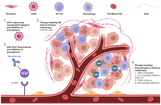 Angiogenesis is the development of vasculature and is increased during cancer progression. Blocking angiogenesis is thus a therapeutic strategy that aims to starve cancer cells [100]. Anti-angiogenic drugs such as bevacizumab and cilengitide affect vascular permeability and the inhibition of tumor growth [101,102]. An oHSV expressing anti-angiogenic vasculostatin which contains an integrin-antagonizing motif leads to the significant inhibition of glioma cell migration and invasion following bevacizumab treatment. This results in a significant extension of survival compared with bevacizumab monotherapy. The combination also increases oHSV infection and replication [103]. Another strategy demonstrated that chelating copper (Cu) could augment the efficacy of oHSV infection and replication by preventing angiogenesis and increasing the serum stability of oHSVs [104] (Figure 3).