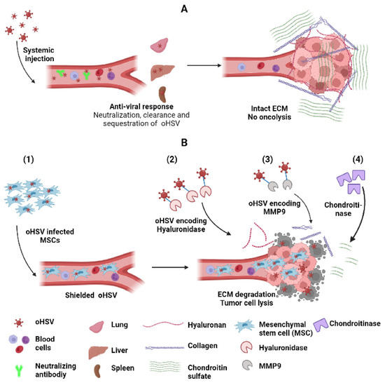 Strategies to improve systemic delivery and spread of oHSV. (A) Systemic delivery of oHSV to tumor cells is hampered by anti-viral response leading to neutralization by complement activation, interaction with blood cells and sequestration and clearance by macrophages in lung, liver (kuffer cells) and spleen. Intra-tumoral oHSV spread is limited by entrapment of oHSV in tumor ECM comprising collagen, hyaluronan and chondroitin sulfate. (B) Various strategies to improve oHSV systemic delivery and spread include (1) the shielding of oHSV by a suitable protective carrier such as MSCs, which facilitates escaping host immune surveillance, allows effective delivery to the tumor, and disrupts tumor ECM constituents, e.g., hyaluronan, collagen and chondroitin sulfate using (2) oHSV encoding hyaluronidase, (3) oHSV encoding MM9, and (4) ECM-degrading enzyme chondroitinase, respectively. These strategies eventually enhance oncolysis and augment oHSV-mediated antitumor effect.