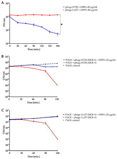 Evaluating virion neutralization of myovirus KT28 over a one-log reduction (>90%) in PFU/mL was obtained after 3 h of incubation with OMVs. In contrast, phage LUZ7 particles infectivity seemed to be not counteracted by bacterial vesicles, as in the presence of OMVs, the PFU titre remained at the initial level throughout the experiment (Figure 2A). The inconsistency in the neutralization efficacy by LPS deposited on OMV surface might be correlated with the differences in the adsorption mechanisms between myo- and podoviruses.