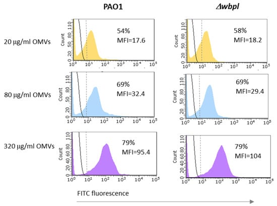 The next part of the study was dedicated to the question of whether OMVs being associated with the bacterial cell can protect against the LPS-specific phages or, conversely, sensitize resistant bacteria to phage infection. To answer that, the PAO1 wild-type strain was used as the phage-sensitive host and its Δwbpl knock-out mutant deficient in the A-band and B-band O-antigens as the phage-resistant strain. First, the association capability of OMVs was determined using flow cytometry (Figure 4). In this assay initially, various concentrations of OMVs were applied to find out the efficiency of cell-vesicle interactions and to check whether the entire population could be covered with FITC-labelled OMVs. As shown in Figure 4, there were no notable differences in association efficacy between PAO1 and the Δwbpl mutant after 3 h of incubation. Although the intensity of association of OMVs was generally correlated with the number of vesicles available, even at their maximum tested amount (corresponding to a concentration of 320 μg/mL), an association of the entire bacterial population was not achieved. Both strains similarly interacted with OMVs at a level close to 80%.