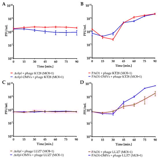 The OMVs association to P. aeruginosa cells as a potential sensitizer/disturbance agent to phage adsorption and propagation evaluated in a modified one-step growth cycle (MOI = 1). The PAO1 wild-type strain was used as the phage-sensitive host, whereas Δwbpl knock-out mutant deficient in O-antigens served as the phage-resistant strain. Phage titre (PFU/mL) of myovirus KT28 (A,B) and podovirus LUZ7 (C,D) were determined every 15 min by the double-agar layer technique. The curves were established on the average of triplicate PFU/mL measurement from two independent experiments ± SEM bars.