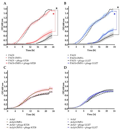 The OMVs association to P. aeruginosa cells as a potential sensitizer/disturbance agent to phage adsorption and propagation evaluated in bacterial culture growth kinetics. The PAO1 wild-type strain was used as the phage-sensitive host, whereas Δwbpl knock-out mutant deficient in O-antigens served as the phage-resistant strain. Bacterial growth was monitored by OD600 measurement using a microplate reader for 24 h at 30 min intervals. The populations were treated with myovirus KT28 (A,C) or podovirus LUZ7 (B,D) at MOI = 1. The phage-uninfected culture without the addition of OMVs was considered as the control. The curves were established on the average of two independent experiments measured in triplicates ± SEM bars. Statistics were performed by Kruskal–Wallis ANOVA rang with pairwise AUC comparisons across groups: * p < 0.05.