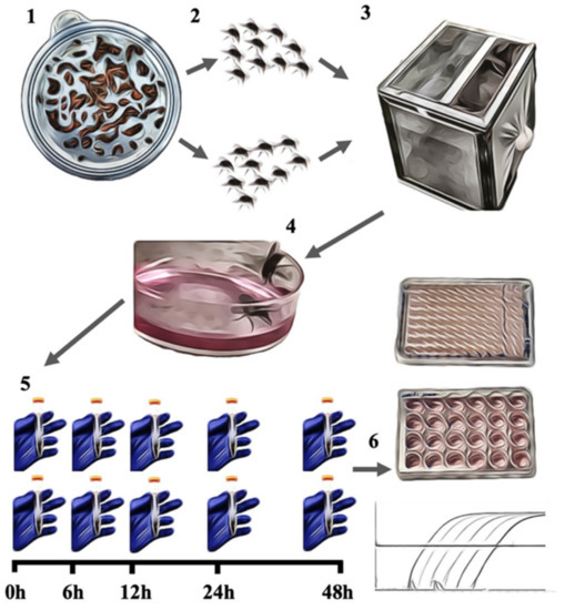 Study design representation. (1) Fly larvae were cultivated; (2) newly emerged flies were sexed; (3) a total of 10 female and 10 male flies were placed in each cage; (4) flies were then exposed to SVA or SwPV solution; (5) flies were collected at five time points and subgroups of five flies from both genders were processed in PBS or in DNA/RNA Shield; (6) the samples were then processed for virus isolation, virus titration, and quantification of the viral nucleic acid.