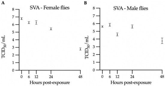 Virus titration in SVA-exposed flies: (A) female groups and (B) male groups. The triangles represent the average of the triplicate titration, and the bars represent the standard error of the mean.