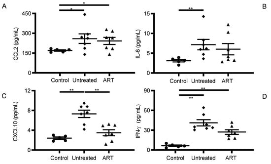 HIV and SIV infection lead to CNS inflammation and the degree of severity is dictated by different factors, such as plasma and CSF viral loads or the stage of HIV/SIV infection []. Pro-inflammatory cytokines and chemokines are usually upregulated and reported to drive CNS disease progression. It has been reported that HIV-infected individuals on suppressive ART continue to have high circulating levels of pro-inflammatory cytokines, which helps to maintain a heightened proinflammatory state []. In this study, we observed that ART significantly reduced levels of some proinflammatory cytokines in peripheral blood and CSF of SIV-infected chRMs (Figure 1 and Figure 2), while others were not affected by the treatment. Although twenty-nine cytokines and chemokines were tested in plasma and CSF samples, CCL2, IL-6, CXCL10, and IFN-γ showed significant changes in the CSF during chronic SIV infection with or without ART.