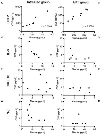 To study whether inflammation markers in plasma predict or reflect changes in the brain, we analyzed correlations of the tested cytokines and chemokines (CCL2, IL-6, CXCL10, and IFN-γ) in paired plasma and CSF samples in each infected group separately (Figure 3). Very interestingly, CCL2, both in the untreated and the ART group, showed a strong positive correlation between plasma and CSF levels (Figure 3A, p = 0.0004 and, p = 0.0028 respectively).