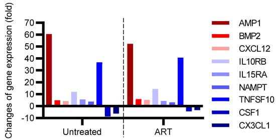 Eighty-four genes were tested. Gene expression with significant (p < 0.05) fold changes compared to the control group is shown in Figure 5. Seven genes were significantly (p < 0.05) upregulated in both the untreated and ART group: AIMP1, BMP2, CXCL12, IL-10RB, IL-15RA, NAMPT, and TNFSF10 (Table 1). Three of these genes had more than a 10-fold increase in both groups. AIMP1, (Aminoacyl tRNA synthetase complex-interacting multifunctional protein 1), which has been linked to the secretion of CCL2 by macrophages and monocytes [], showed a 61-fold expression increase in the untreated group, and a 52-fold increase in the ART group. IL-10RB (Interleukin-10 receptor subunit β-like), which is related to antiviral activity and is the receptor of the anti-inflammatory cytokine IL-10 [,], showed a 12-fold increase in the untreated group, and a 14-fold increase in the ART group (Table 1). TNFSF10, tumor necrosis factor ligand superfamily member 10, related to apoptosis and inflammation [], was 37-fold higher in the untreated group and even higher in the ART group with a 41-fold change (Table 1). Only 2 genes, namely, CSF1, colony-stimulating factor 1 (macrophage), and CX3CL1 (C-X3-C motif chemokine ligand 1) were downregulated in both groups. Interestingly, CCL2 and IL-6, which showed high expression in the CSF showed no significant changes at the gene expression level in the basal ganglia in either group.
