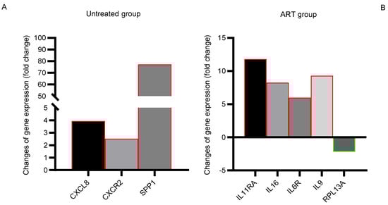 In addition to the previous section showing genes that were parallelly up/down-regulated in basal ganglia in both untreated and ART groups, Figure 6 shows genes that were differentially modulated only in one of the two groups compared to the control group. SPP1 (secreted phosphoprotein 1, also known as osteopontin, OPN), associated with neuroinflammation in macaques [,], was strikingly increased by 77-fold in the untreated group. In addition, CXCL8 and CXCR2 were upregulated with a 3- and 4-fold increase in untreated animals but not in the ART group (Figure 6A, Table 1). In contrast, the ART group showed an upregulation of the genes IL-11RA, IL-16, IL-6R, and IL-9 in a range of 8~12-fold. In contrast, RPL13A was slightly (2-fold) downregulated compared to the control group (Figure 6B, Table 1).