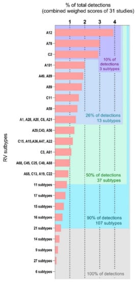 Figure 1 shows RV subtype distribution in the panel of 31 studies, expressed in percentages of total detections. Three subtypes (less than 2% of all RVs), RV-A12, A78, and -C2, represented 10% of total detections. In comparison, the 56 lowest ranked subtypes (33% of all RVs) also amounted to 10% of all RV detections in this panel of studies. Within the 50% most represented RVs, 24 subtypes belonged to RV-A species and 13 to RV-C species. There was no RV-B present among the subtypes most often detected in clinical studies. Subtypes underlined in our meta-analysis approach were also described specifically in individual studies included in our panel. In 2013, Sansone et al. reported a predominance of RV-A78, -A49, -C12 in RV-positive samples from hospitalized children under five years in Sweden [156]. In their 2016 study typing 745 samples sent to diagnostic between 2007 and 2012 in the Netherlands, Van der Linden et al. identified RV-A12, -A78, and -C2 as the predominant subtypes. RV-A12 was noted to occur in clusters while -C2 and -A78 were detected over multiple years [49]. Similarly, Zhao et al. reported RV-A12, -A78, -A89, -C2, and -C6 among the predominant subtypes detected among 280 respiratory samples obtained from children with a respiratory illness between 2013 and 2015 [53]. At the same period (2014–2017), Andres et al. typed 1771 RV-positive samples obtained from patients with a respiratory tract infection suspicion. Once again, RV-A78, -A22, and -A49 and RV-C2, -C15, and -C12 were the most prevalent RVs over this period [157]. Clinical studies focusing on a smaller number of samples also reported RV-A12 as very prevalent over multiple seasons [158]. RV-A101 ranked fourth in our meta-analysis and was also mentioned as one commonly recurring subtypes [101,159].