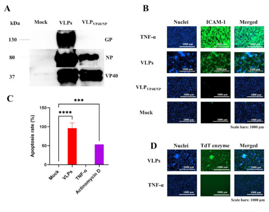 In this study, we investigated and confirmed the upregulation of ICAM-1 expression on the surface of ECs following Ebola VLPs treatment. VLPs with GP (referred to as VLPs) and VLPs without GP (referred to as VLPVP40/NP) were generated by transient transfection of expression plasmids into HEK293T cells. Purified VLPs were detected by Western blotting, which was positive for the presence of viral structural proteins as determined with monoclonal antibodies (Figure 1A). ECs were treated with VLPs or VLPVP40/NP for 48 h, and the activation of ECs was demonstrated by the upregulation of ICAM-1 expression using immunofluorescence assay. PECAM-1 expression level was also assessed to confirm the integrity of the EC monolayers (Figure S1). Similar to the positive control TNF-α (10 ng/mL), VLPs potently induced the upregulation of ICAM-1 expression on the surface of ECs (Figure 1B). VLPs exposure also led to the disruption of ECs with cells exhibiting typical apoptotic morphology with shrinkage and condensation of nuclei, as shown by nuclear staining. In contrast, no cytopathic effects were observed after the treatment of ECs with TNF-α. These results indicate that Ebola VLPs directly activate and disrupt ECs. Moreover, VLPVP40/NP did not induce the upregulation of ICAM-1 expression or cytotoxicity (Figure 1B), suggesting that GP is required for vascular disruption.
