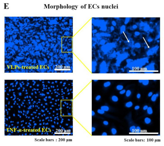 Further, to confirm whether the observed cytopathic effects were due to apoptotic or necrotic cell death, fluorescent staining was performed using the TUNEL assay. In line with the results obtained with Hoechst staining, TUNEL staining showed a significant increase in the number of apoptotic cells among VLPs-treated ECs compared to that among TNF-α-treated ECs, similarly to the positive control actinomycin D treatment (Figure 1C). Images of nuclear staining confirmed the apoptotic morphology of cells treated with VLPs (Figure 1D), exhibiting condensed, aggregated, and disrupted nuclei (Figure 1E). Taken together, these results demonstrate that VLPs, but not TNF-α, induced ECs apoptosis in vitro.