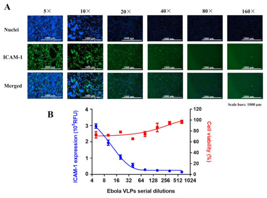 Ebola VLPs activate ECs in a dose-dependent manner. (A,B) ECs were treated with serial dilutions of VLPs for 48 h, fixed, and permeabilized for detection by immunofluorescence using an antibody directed against ICAM-1. Cell viability was determined using the Cell Counting Kit-8 assay. (A) Immunofluorescence images are shown for each VLPs dilution factor. (B) Dose-dependent curves showing induced ICAM-1 expression (blue) and cell viability (red). Data are representative of two independent experiments (n = 3). VLPs: virus-like particles; ECs: endothelial cells; ICAM-1: intercellular adhesion molecules 1.
