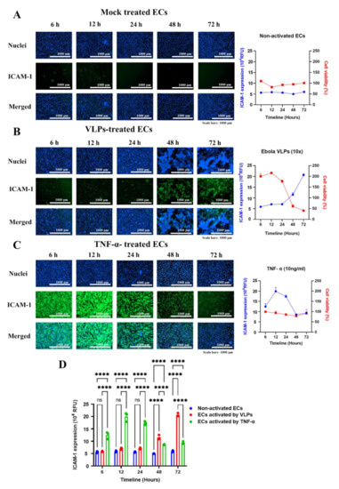 To examine the kinetics of ICAM-1 induction on the surface of ECs, cells were treated with VLPs, TNF-α (10 ng/mL), or medium alone (mock-treated), and the resulting expression of ICAM-1 was detected at 6, 12, 24, 48, and 72 h after treatment. Additionally, we investigated the kinetics of ECs viability following treatment using the cell counting kit-8 assay. ICAM-1 expression was not detected on ECs treated with medium alone, and there was no change in their viability over time (Figure 3A). In contrast, VLPs-treated cells showed a significant increase in ICAM-1 expression from 48 h post-treatment, with cells presenting cytopathic effects (Figure 3B). Compared to ECs treated with TNF-α (Figure 3C), ECs treated with VLPs showed a drastic increase in cell viability from 6 h with a peak at 12 h before decreasing from 48 h (Figure 3B, graph to the right). Early expression of ICAM-1 by TNF-α treatment was detected at 6 h post-treatment and increased significantly at 12 h post-treatment before decreasing over time (Figure 3C). Cell viability under TNF-α treatment was not significantly affected, and no cytopathic effects were observed (Figure 3C). Overall, ICAM-1 expression was observed early with TNF-α treatment compared to the late expression with VLPs treatment (Figure 3D), associated with cell disruption. These results suggest that ECs activation and disruption induced by VLPs and TNF-α follow different kinetic patterns.
