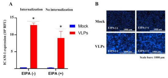 Micropinocytosis inhibition did not suppress VLPs-induced ICAM-1 upregulation and associated cytopathic effects. ECs were pretreated with 10 µM EIPA for 30 min at 37 °C before the addition of VLPs. The cells were incubated for 48 h at 37 °C, and the expression level of ICAM-1 on ECs and the morphology of ECs were assessed using immunofluorescence and nuclei staining, respectively. ECs treated with the medium (mock) were used as control. (A) Graphic representation of ICAM-1 expression. (B) Images of stained nuclei showing the cytopathic effect following the exposure to VLPs. Data are the representative of two experiments performed in duplicate and are presented as the mean ± SD. Statistical significance is shown: * p ≤ 0.05. VLP-treated ECs with EIPA and without EIPA were compared applying two-way ANOVA and followed by Šídák’s multiple comparisons test. VLPs: virus-like particles; ECs: endothelial cells; ICAM-1: intercellular adhesion molecules 1.