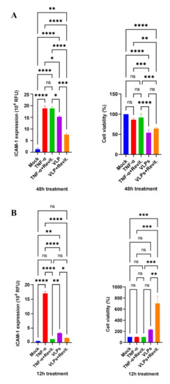Effect of RevitaCell on VLPs- and TNF-α-induced ICAM-1 upregulation. (A) ECs were pre-treated for 1 h with RevitaCell (1×) and then treated with VLPs (10×) or TNF-α (10 ng/mL). Forty-eight hours after treatment, cells were fixed and immunostained for fluorescence measurement. For each condition, the percentage of ICAM-1 expression was calculated as the ratio of the expression level in the wells pre-treated with RevitaCell to the expression level in wells treated with either VLPs or TNF-α only. Cell viability was also assessed using the cell counting kit-8 according to the manufacturer’s recommendations. Data for ICAM-1 expression and cell viability in the presence of RevitaCell are shown, representing mean ± SD of triplicate results from two independent experiments. (B) To study the effect of RevitaCell at early incubation time, a similar pre-treatment with RevitaCell (1×) was performed. Fluorescence was measured 12 h after the addition of VLPs (10×) or TNF-α (10 ng/mL). EC viability was similarly assessed 12 h after appropriate treatments. Data show relative VLPs- or TNF-α-mediated ICAM-1 expression levels with or without RevitaCell (left), as well as cell viability under corresponding treatment (right). One-way ANOVA followed by Tukey post-test was applied to compare data, which are presented as mean ± SD of triplicate results. Statistical significance is shown: **** Extremely significant (p < 0.0001), *** Extremely significant (p = 0.0001 to 0.001), ** Very significant (p = 0.001 to 0.01), * Significant (p = 0.01 to 0.05), ns not significant (p ≥ 0.05). VLPs: virus-like particles; ECs: endothelial cells; ICAM-1: intercellular adhesion molecules 1.