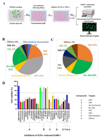 Upon completion of the initial screening (Table S1), 28 and 14 compounds inhibiting VLPs- and TNF-α-induced ICAM-1 expression were respectively identified at >70% inhibition level. The corresponding targets of VLPs- and TNF-α-induced ICAM-1 inhibitors are shown in Figure 6B, C, respectively. Importantly, we noticed that most of the inhibitors targeted two host proteins in both VLPs- and TNF-α-mediated ICAM-1 expression: the breakpoint cluster region-abelson (Bcr-Abl) protein and focal adhesion kinase (FAK) (Figure 6B,C). Heat shock proteins (HSP) were identified as the highest hit targets specific to VLPs-induced ICAM-1 expression. None of the inhibitors of TNF-α-induced ICAM-1 expression targeted the heat shock proteins.
