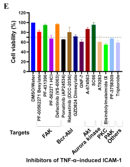 Screening of host cytoskeletal signaling compounds inhibiting VLPs-mediated endothelial cells activation (A) Illustration of the screening strategy. The screening was conducted on VLPs- or TNF-α-treated cells. Compounds (n =179) were evaluated for their effects on the inhibition of ICAM-1 expression. The fluorescence corresponding to the expression of ICAM-1 was measured 12 and 48 h post-treatment for TNF-α- or VLPs-treated cells, respectively, following immunostaining. The protective effects of the compounds were assessed through nuclear staining and imaging. RevitaCell Supplement was used as the positive control. Compounds exhibiting 70% inhibition of ICAM-1 expression were considered effective inhibitors, with 28 and 14 of them inhibiting VLPs- and TNF-α-induced ICAM-1 expression, respectively. (B) The target host proteins for VLPs-induced ICAM-1 inhibitors and (C) TNF-α-induced ICAM-1 inhibitors are shown. (D) The inhibitors of VLPs-induced ICAM-1 expression targeting FAK and (E) those of TNF-α-induced ICAM-1 expression targeting FAK, Akt, and Bcr-Abl showed less than 30% cytotoxicity (limit shown by grid lines at 70% cell viability). VLPs: virus-like particles; ECs: endothelial cells; ICAM-1: intercellular adhesion molecules 1; Akt: Ak strain transforming kinase; FAK: Focal adhesion kinase; Bcr-Abl: breakpoint cluster region-abelson.