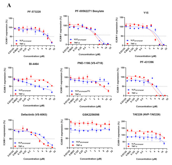 Since the Rho/ROCK pathway controls EC dysfunction through the regulation of cytoskeleton organization [23], we screened the inhibitors of host cytoskeleton signaling pathways and identified FAK inhibitors as potent inhibitors of ICAM-1 upregulation mediated by both TNF-α and VLPs (Figure 6B,C). Among the nine FAK inhibitors analyzed for their dose-response activity, BI-4464 was the most effective against VLPs-induced ICAM-1 expression, while Defactinib (VS-6063) showed potency against both VLPs- and TNF-α-induced ICAM-1 expression (Figure 7).