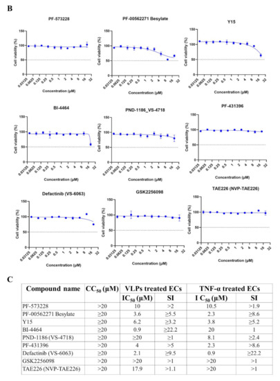 To assess the potency and specificity of the selected FAK inhibitors on VLPs- or TNF-α-treated cells, we tested their dose-dependency at concentrations up to 20 µM. The cytotoxicity of the compounds was also evaluated in the same concentration range, including all nine FAK inhibitors contained in the screened library. Among them, seven and eight compounds dose-dependently inhibited VLPs- and TNF-α-induced ICAM-1 expression, respectively. As shown in Figure 7A, in the VLPs-treated ECs, four compounds showed high potency with IC50 < 5 µM. BI-4464 was the most potent with an IC50 of 0.9 µM, followed by Defactinib (VS-6063) with an IC50 of 2.1 µM, PF-00562271 Besylate with an IC50 of 3.6 µM, and PF-431396 with an IC50 of 4 µM. Y15, PF-573228, and TAE226 (NVP-TAE226) were also effective with IC50 values > 5 µM and displayed low toxicity in ECs. Additionally, BI-4464 demonstrated a selective index (SI) of 22.2, indicating its highly specific inhibitory effect (Figure 7C). Four potent compounds showed IC50 < 5 µM in the TNF-α-treated group, including Defactinib (VS-6063) with the highest IC50 value (0.9 µM), PF-00562271 Besylate with an IC50 of 2.3 µM, PF-431396 with an IC50 of 2.3 µM, and Y15 with an IC50 of 3.8 µM (Figure 7A,C). GSK2256098 affected neither VLPs- nor TNF-α-induced ICAM-1 expression. Taken together, Defactinib (VS-6063) could be considered a potent inhibitor of both VLPs- and TNF-α-induced ICAM-1 expression, with SI ranging between 9.5 and 22.2. BI-4464, which showed potency in VLPs-treated ECs, did not potently inhibit ICAM-1 expression in TNF-α-treated ECs. As shown in Figure 7B, none of the compounds showed toxicity on untreated ECs (CC50 ≥ 20 µM).