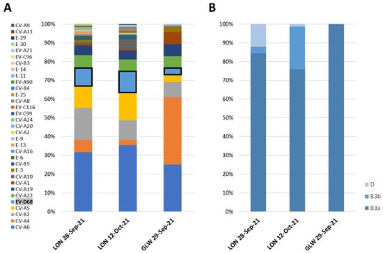 Entire-capsid EV sequences were obtained by NGS analysis of mECRA products generated from RNA extracted from two London wastewater samples collected on 28 September 2021 and 12 October 2021 and one wastewater sample collected in Glasgow on 29 September 2021. As shown in Figure 1A, EV strains corresponding to all four species A, B, C, and D were identified with between 11 and 28 different serotypes present in each sample, in line with previous findings of EV serotype prevalence in wastewater samples from both locations, with samples from Glasgow showing lower serotype diversity [25]. This might be due to the fact that samples collected in Glasgow were grab samples, while samples from London were composite samples collected during a 24 h period. In addition, the catchment area covered by the London sewage plant is about 10 times larger than that covered by the plant in Glasgow.