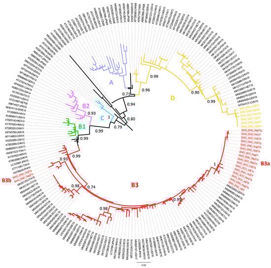 mECRA products from three representative wastewater samples investigated in this study were analysed by NGS for an additional confirmation of the presence of EV-D68 strains using previously validated and reported methods [24,25,26,27]. Sequencing libraries were constructed through random enzymatic fragmentation using the DNA Prep kit (formerly known as Nextera DNA Flex) and indexed using Nextera DNA Unique Dual Indexes (both Illumina, San Diego, CA, USA). These libraries were pooled in equimolar concentrations according to manufacturer’s instructions and sequenced with 250 bp paired-end reads on MiSeq v2 (500 cycles) kit (Illumina, San Diego, CA, USA). Initial demultiplexing was performed on-board by the MiSeq Reporter software. FASTQ sequencing data were adapter and quality trimmed by Cutadapt v2.10 (30) for a minimum Phred score of Q30, minimal read length of 75 bp, and 0 ambiguous nucleotides. Whole-capsid EV sequences were generated by the de novo assembly of filtered NGS reads as described before [24,25,26,27]. Briefly, filtered NGS reads were assembled de novo using stringent assembly conditions: minimum 50 base overlap, minimum overlap identity of 98%, maximum 2% mismatches per read, and only using paired hits during assembly. In addition, the options to produce scaffolds and ignore words repeated more than 100–1000 times, available in the Geneious 10.2.3 assembler (Biomatters, Auckland, New Zealand), were selected to improve the quality of assembly. Final contig consensus sequences were analysed using the RIVM and BLAST online sequence analysis tools [28,29], and EV serotypes were assigned on the basis of their VP1 sequence identity. EV-D68 VP1 sequences were identified for further phylogenetic studies.