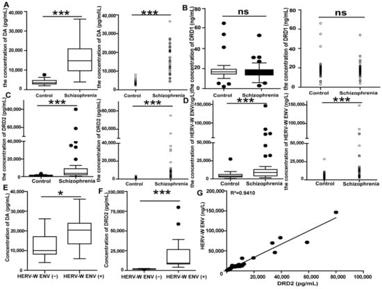 3.2. Correlation and Consistency among DA, HERV-W ENV, and DRD2 in First-Episode Schizophrenia Patients