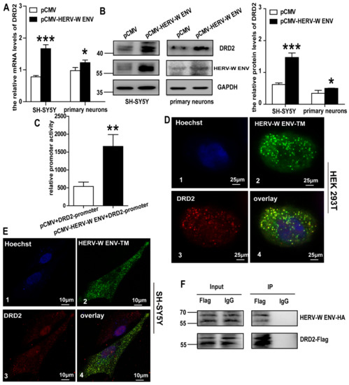 3.5. HERV-W ENV Directly Interacts with DRD2 and Increases the Expression of DRD2