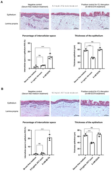 Immediately after the 24 h treatment with the bacterial toxins, the explants were washed and fixed in 3.6% formaldehyde for 24 h for morphological analysis. Paraffin embedding of the explants was carried out using an automated system (STP 420D, Micron, Praran, Merelbeke, Belgium). Consecutive sections of 8 μm thick were cut, deparaffinized in xylene, rehydrated in descending grades of alcohol, stained with HE, dehydrated in ascending grades of alcohol and xylene, and finally mounted with DPX (DPX mountant, BDH Laboratory Supplies, Poole, UK). To evaluate the effect of the bacterial toxins on epithelial integrity and morphology, several parameters were evaluated by light microscopy. The percentage of intercellular space between the epithelial cells and the thickness of the epithelial layer were measured using Image J software (Image J, U.S. National Institutes of Health, Bethesda, ML, USA).